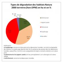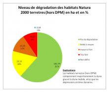 Plus de 60% des habitats terrestres présentent aucune dégradation. Pour le reste, il s'agit du piétiment lié aux cheminements (piétion, vélo, voiture) mais également à la dégradation de la dune par les lapins, aux apports azotés d'origine naturelle ou liés aux activités humaines, à l'enfrichement lié à l'évolution spontannée de la végétation, et au le pâturage par les lapins.